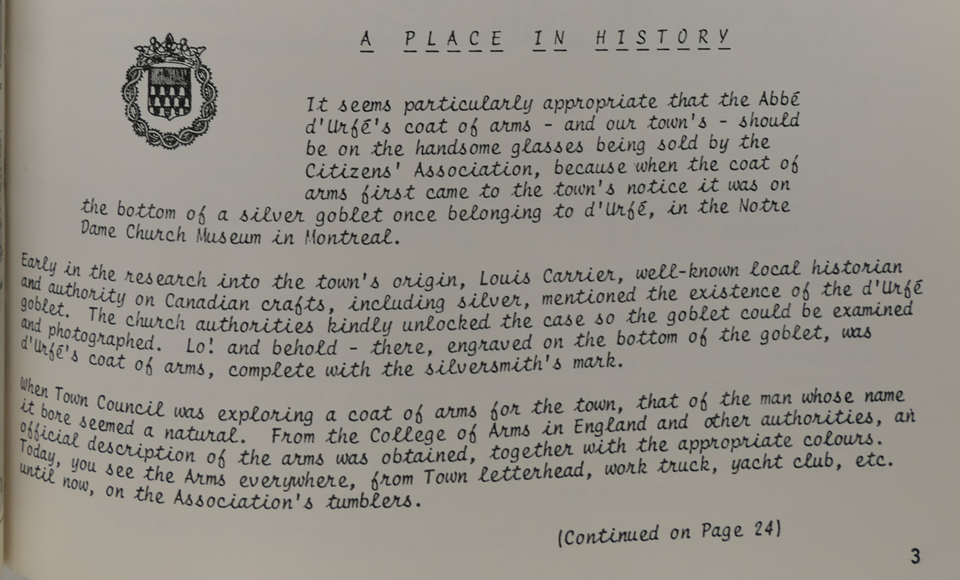 It seems particularly appropriate that the Abbé d'Urfé's coat of arms - and our town's - should be on the handsome glasses being sold by the Citizens' Association, because when the coat of arms first came to the town's notice it was on the bottom of a silver goblet once belonging to d'Urfé, in the Notre Dame Church Museum in Montreal.